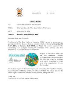 The Council of the Cree Nation of Nemaska (CNN) is proud to announce our participation in the Quebec Grande Semaine initiative, declaring November 18 to 24, 2024, as Nemaska Early Childhood Week. This week is dedicated to celebrating our youngest Community members, their families, and the importance of early childhood development.